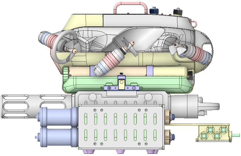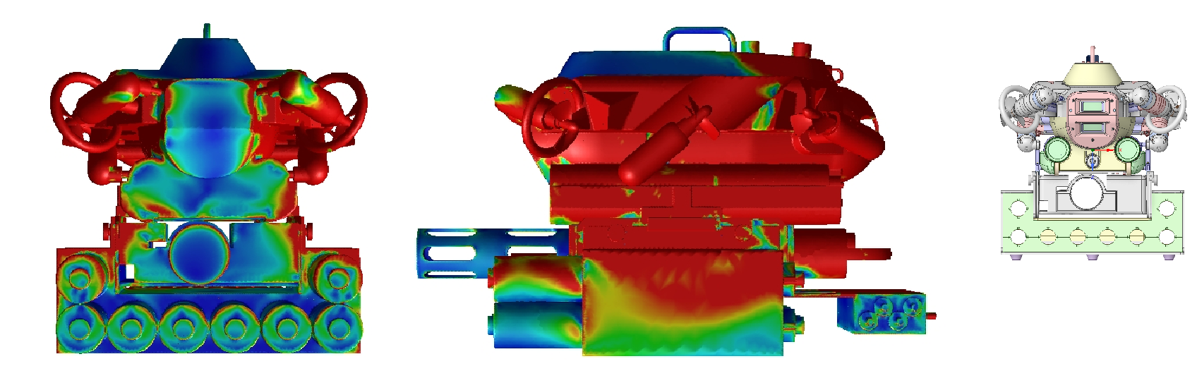 机械运动:通过CFD模拟水下采样机器人运动状态,能够详细获取各个螺旋桨引起的流体流动、推进力以及螺旋桨材料的应力情况,并能模拟取样时机器本身的干扰状况。