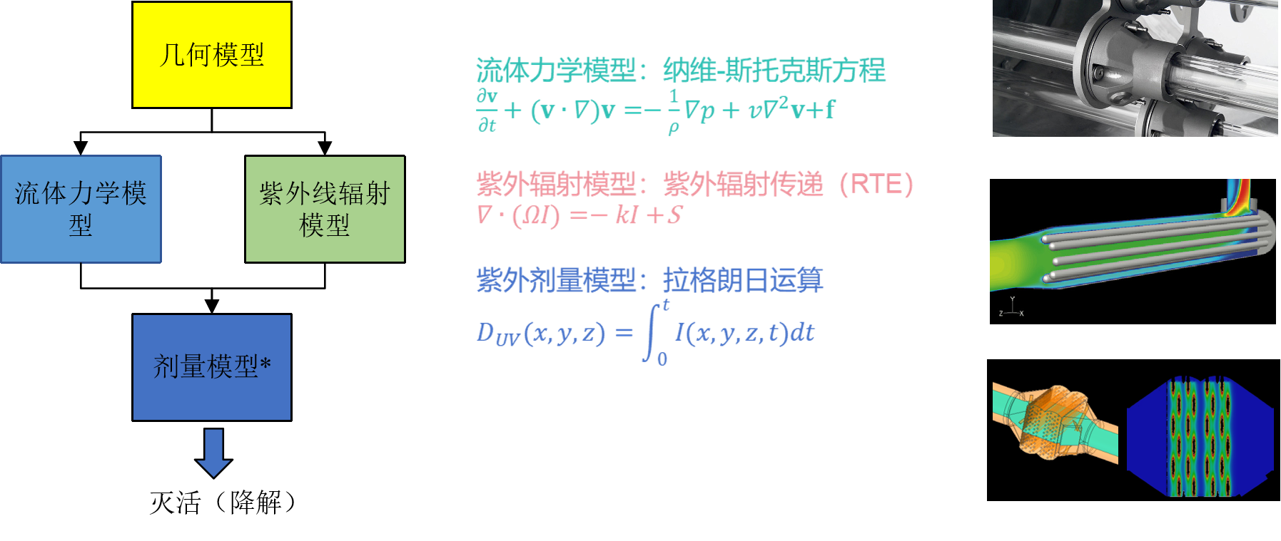 通过耦合纳维-斯托克斯方程模拟流体流动和辐射传递方程计算紫外光强分布,结合路径积分计算累积剂量,精准优化反应器性能。