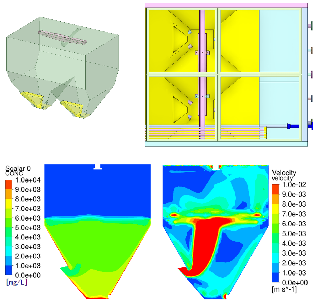 CFD能够精确地模拟废水处理设备内部的流体流动和污泥沉降情况,通过详细设定具体结构、运行参数并分析对比,可确定设备的最佳结构和运行工况,从而提升沉淀设备处理负荷并降低能耗。